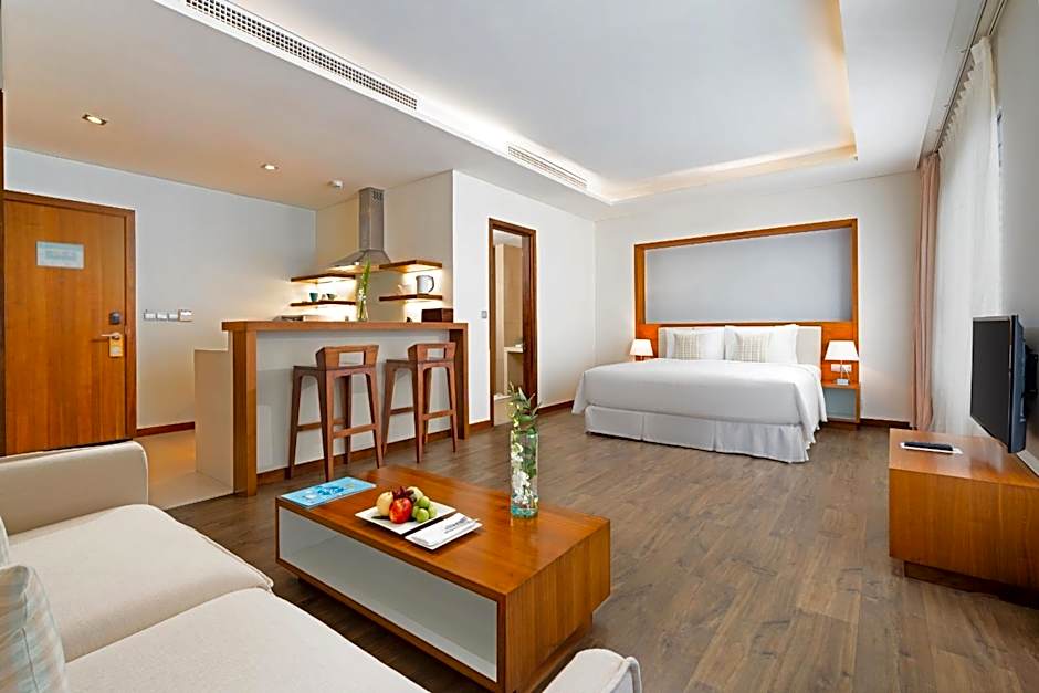 This modern and spacious apartment come with an open-plan living area. It features a balcony with direct sea views, a kitchen and bedroom with a king sized bed and private bathroom.